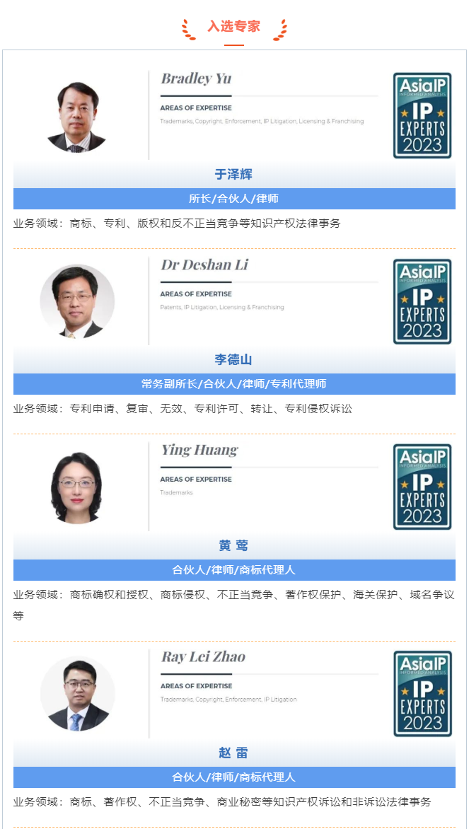 近日,国际权威知识产权媒体《亚洲知识产权》(Asia IP)发布了2023年度“中国知识产权专家百强榜”(Top 100 IP Experts in China),集佳于泽辉、李德山、黄莺、赵雷、潘炜5位合伙人因其优质的专业服务及海内外业界与客户的普遍认可荣登百强榜单!